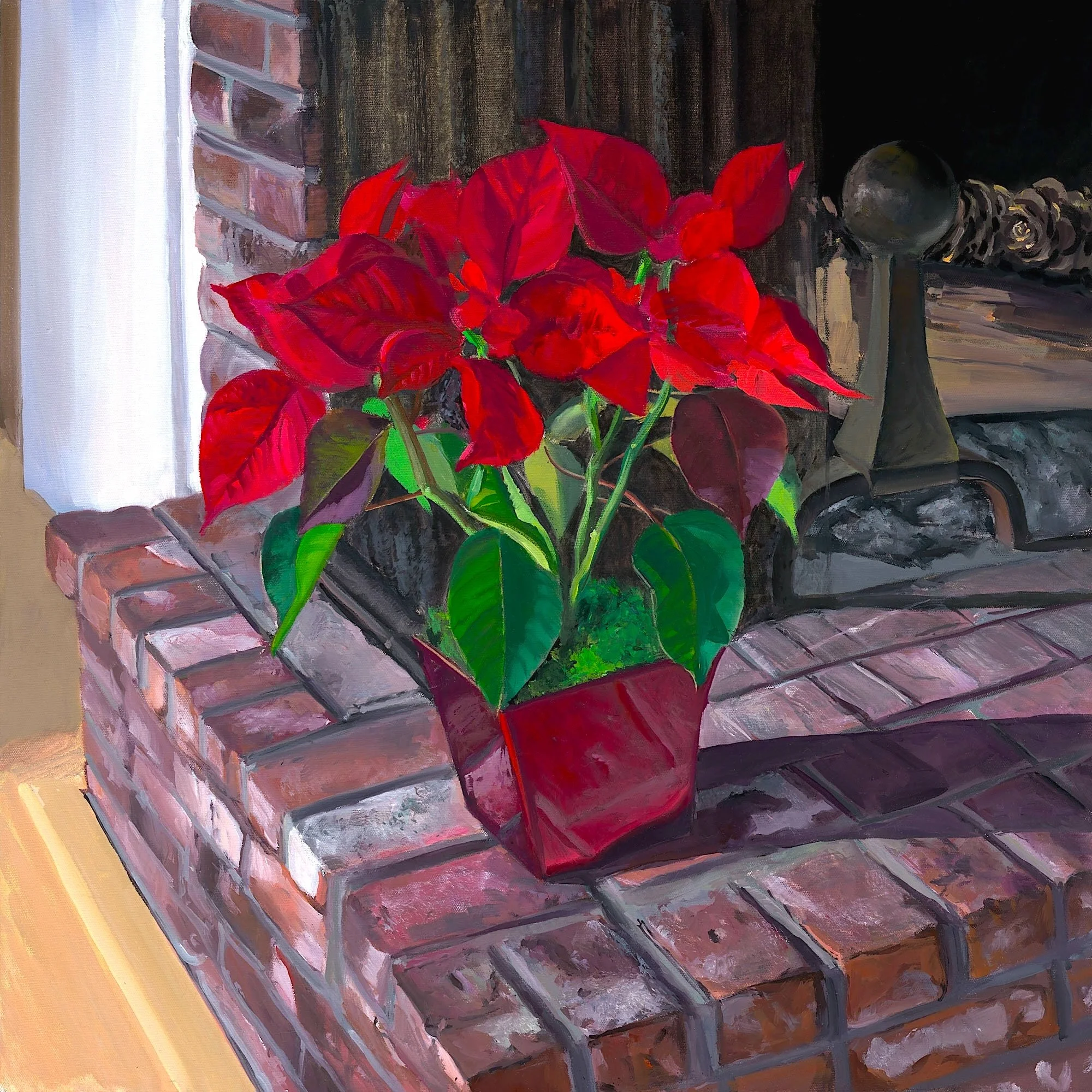 On a tilted hearth where bricks lie marred and bare, a poinsettia flares.